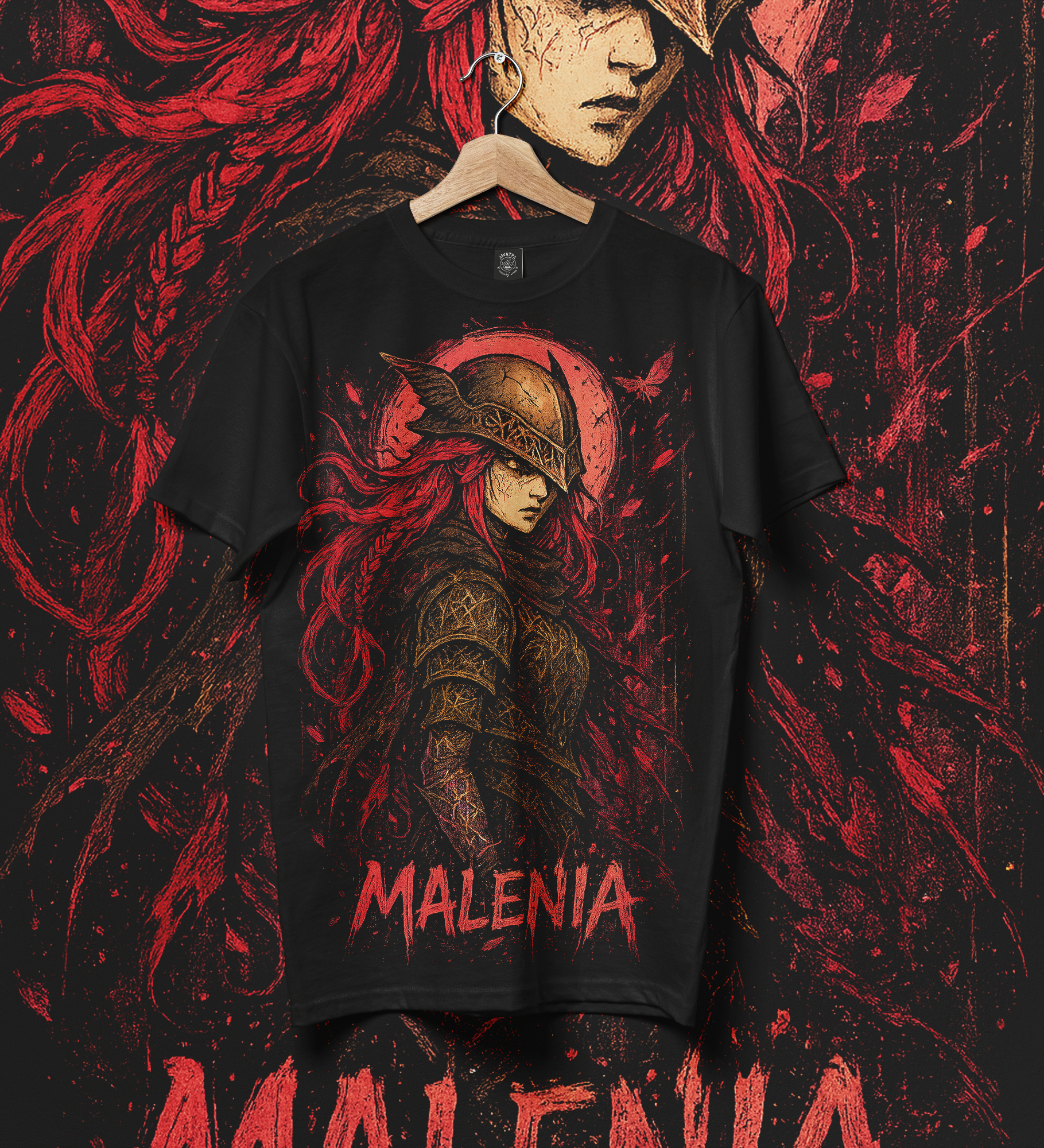 Inspirada em uma das personagens mais temidas e reverenciadas de Elden Ring, esta peça traz à vida Malenia, a guerreira escarlate, em uma arte brutalmente bela, marcada por traços intensos, sombras profundas e um vermelho flamejante que exala poder.