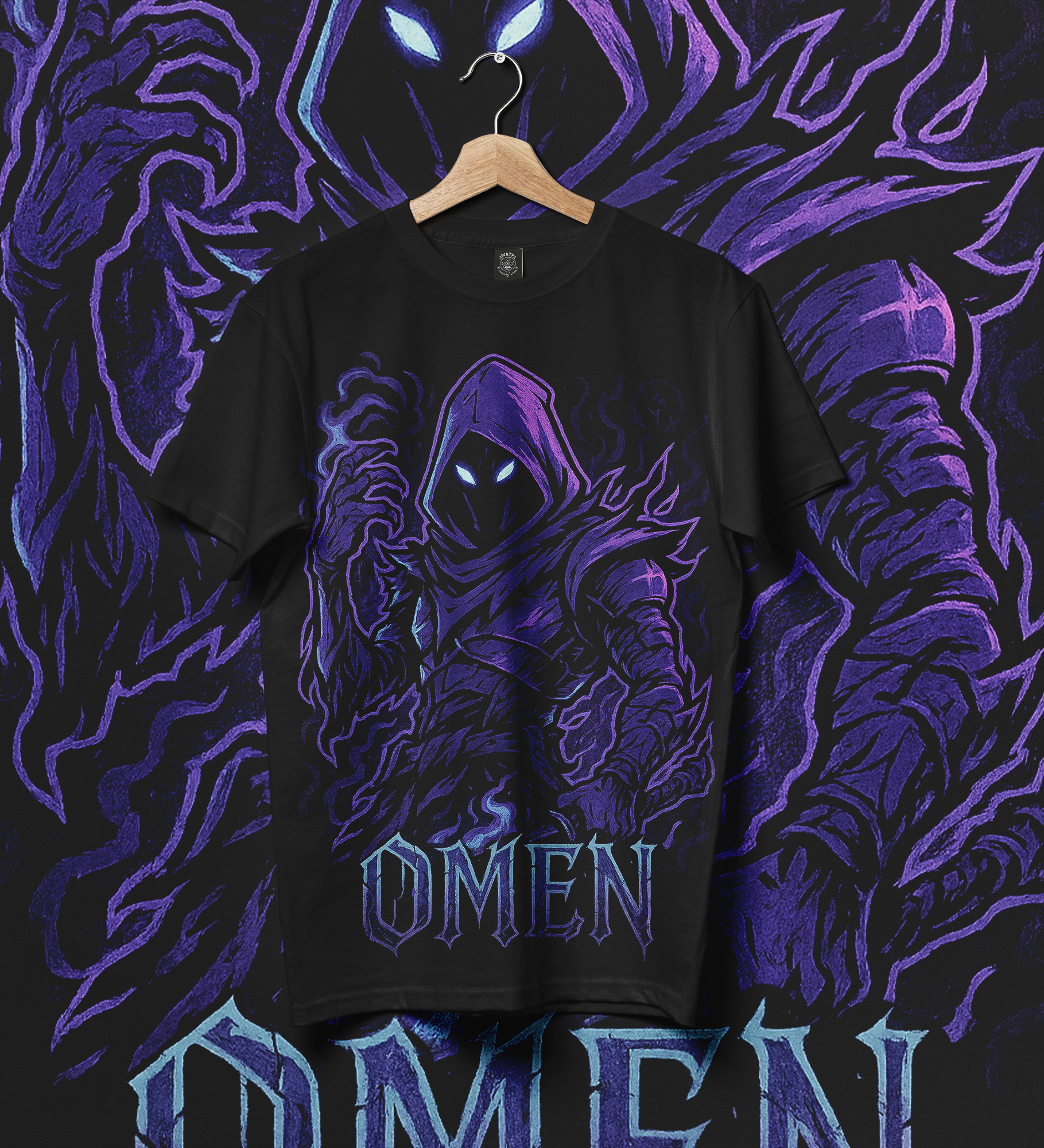 A estampa explode em tons roxos etéreos contra o preto profundo, uma aura de poder que hipnotiza e desafia. Detalhes precisos, linhas afiadas e símbolos místicos transformam a fúria contida em arte viva — um feitiço que toca pele e alma.