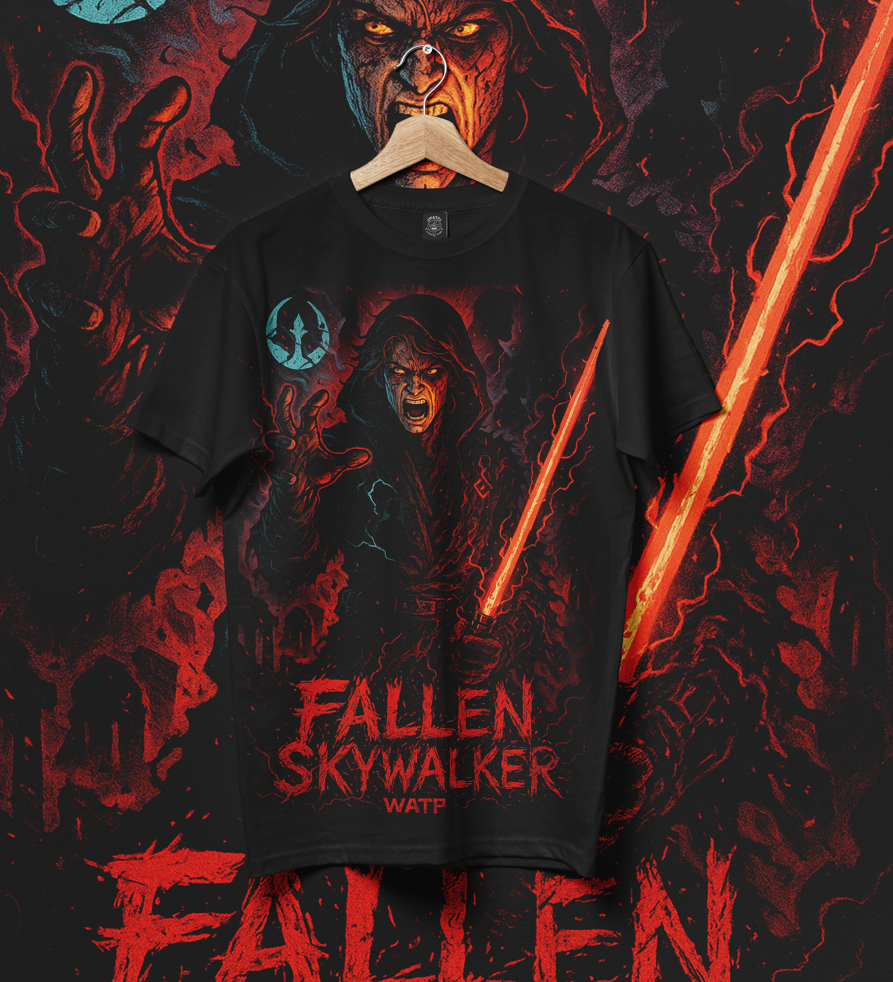 A camiseta FALLEN SKYWALKER mergulha no abismo da redenção perdida. A figura de Anakin em sua forma mais sombria, envolto em sombras carmesins e fúria ardente, empunha sua lâmina com o poder de mil mundos desfeitos.